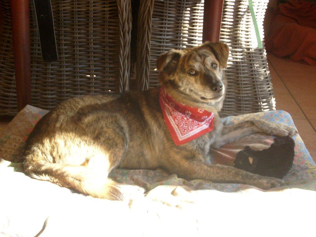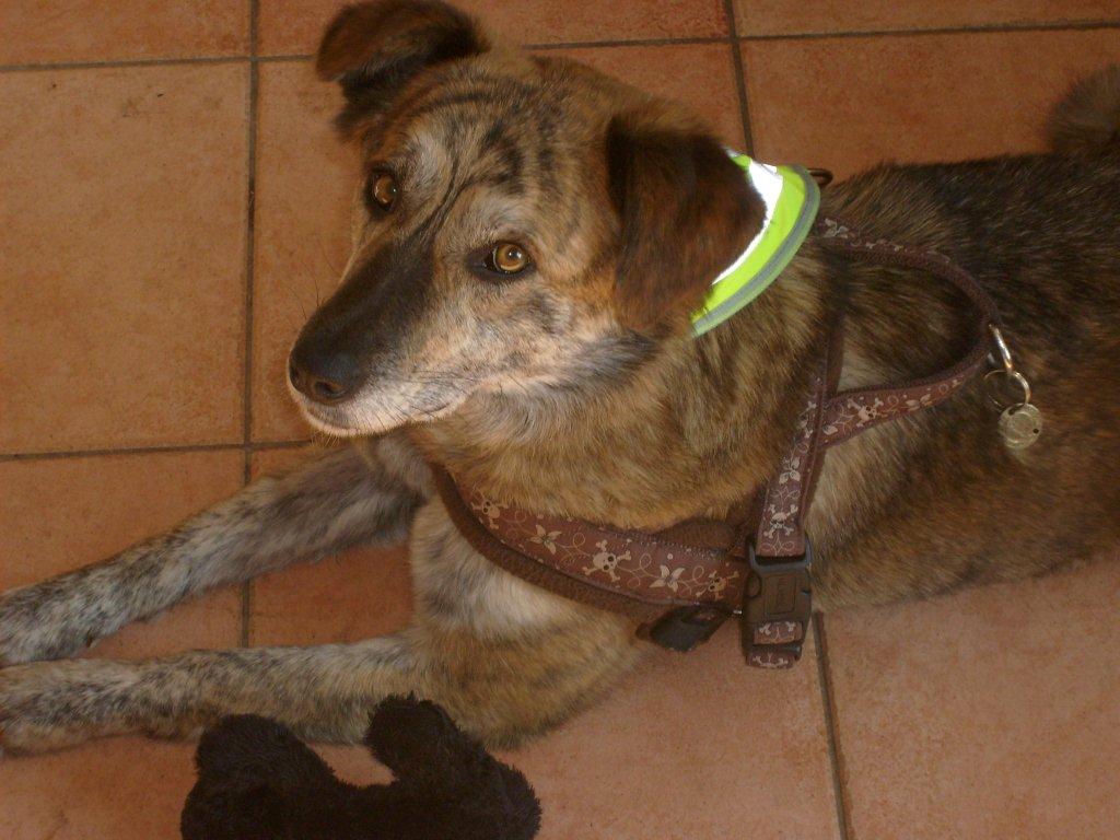 Thuis maakte ik buiten kennis met mijn colliebroer Cheyenne. Wat was ik bang en gromde ik erg tegen hem! Ik dacht dat hij me net als veel andere honden in het asiel wilde pakken, maar hij liep me gewoon rustig voorbij. Hij blijkt gelukkig een rustige hond die me helemaal accepteert zoals ik ben!