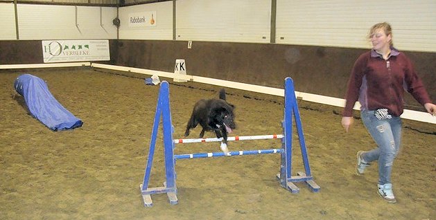 Inmiddels volgt hij samen met onze dochter een behendigheidscursus. Dat wordt gegeven in een manege, dus veilig! Hij vindt “het werken” zichtbaar heel erg leuk! Hij leert snel, alleen de tunnel is nog een probleem. Hij bijt zelfs af en toe van zich af naar andere honden, iets wat we eerder nooit hebben gezien, voorheen was hij gewoon één blok onderdanigheid.