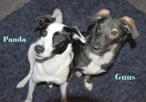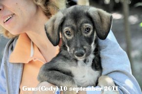 In oktober 2011 was het dan eindelijk zo ver. We konden Guus(in Roemenië: Cody) ophalen. Op Schiphol reageerde hij al heel relaxed en leek hij het allemaal wel gezellig te vinden. Bij thuiskomst eerst maar even buiten met Panda laten kennismaken. Datgene wat we hadden gehoopt, en Panda kennende ook wel verwacht, gebeurde. Het was even snuffelen en al gauw dolle pret. Guus loopt mee naar binnen alsof hij hier al jaren woont. De eerste nacht toch maar even op de bank gaan liggen. Guus slaapt rustig naast mij in zijn bench en snurkt zelfs. Als ik naar hem kijk lijkt hij voldaan en ik voel ‘dit zit wel goed’.